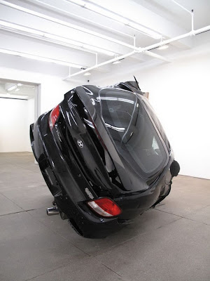 In London's Saatchi Gallery, an exhibition of sculptures by German artist Dirk Skrebera.The sculptures represent two of the broken car Mitsubishi Eclipse Spyder and the Hyundai Tiburon.Monument to bad driving.