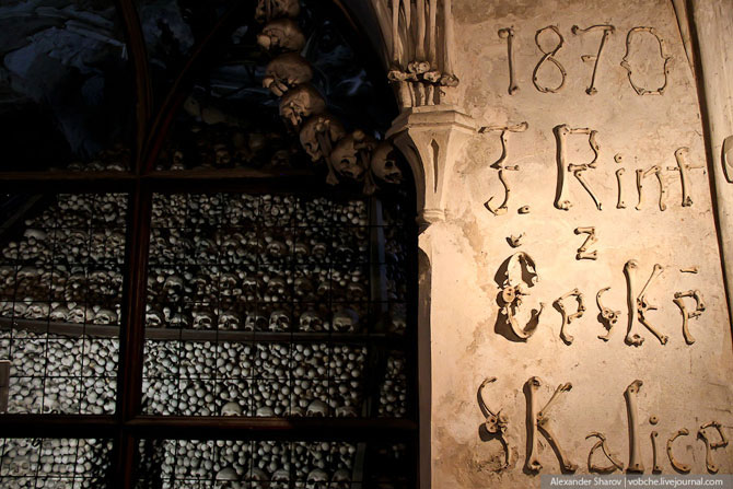 In 1870, the Schwarzenberg hired a woodcarver Frantisek Rint to he put in order a pile of stacked bones ... The Master has left his signature right on the wall of the church, the material, of course, were the bones ...